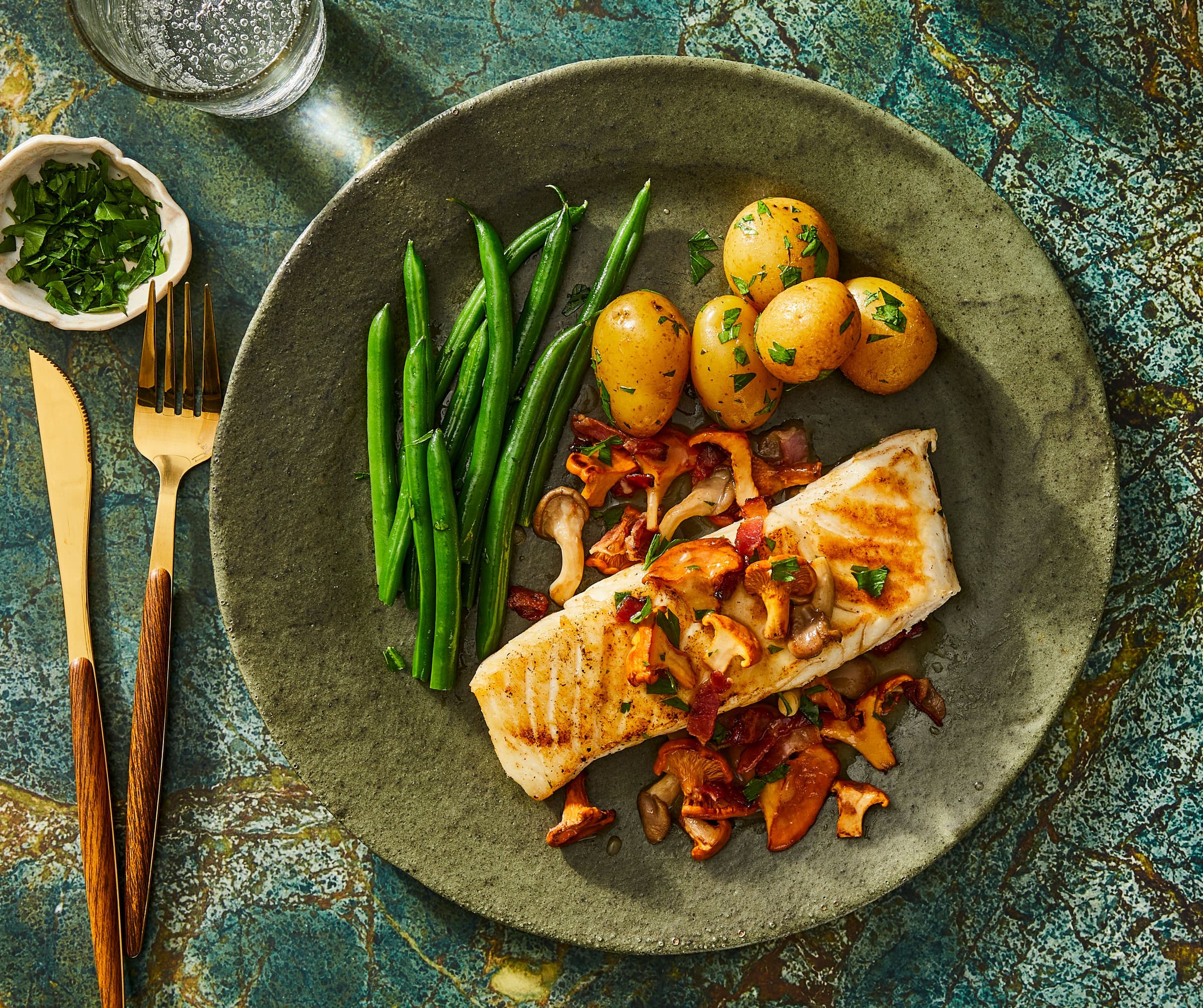 Pacific cod is especially lean. It has a mild flavor with delicate texture and medium flakes after cooking. It’s a bit fragile in a skillet, making nonstick the obvious choice of cooking vessel. Cod tends to release a lot of liquid in the pan which glues it to the surface, making flipping a fillet intact almost impossible. A liberal sprinkling of salt 10 minutes before cooking will firm up the flesh and draw out excess moisture, making it easier to pan-sear. Be sure to rinse and pat dry before adding it to the pan. Another technique used in restaurants is to lightly dust it with flour (just a sprinkle) before pan-searing. It creates a protective coating that helps the fish release from the pan more easily. Finally, don’t pan-sear cod in a dry pan or tiny bit of oil. Like a dusting of flour, the oil creates a buffer between the fish and the skillet.